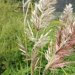 多年生,高大丛生草本。秆高1.5-3米,基部坚硬木质,花序以下部分具白色丝 蔗茅 状毛,有多数具髭毛的节,节下被白粉。叶鞘大多长于节间,上部或边缘被柔毛,鞘口生繸毛;叶舌质厚,长1-2毫米,顶端截平,具纤毛;叶片宽条形,长20-60厘米,宽1-2厘米,扁平或内卷,基部较窄,顶端长渐尖,无毛,下面被白粉,微粗糙,边缘粗糙, 中脉粗壮。圆锥花序大型直立,长20-30厘米,宽2-3厘米,主轴密生丝状柔毛;分枝稠密,长2-5厘米,二回分出小枝,总状花序轴节间与小穗柄长为小穗的2/3-3/4,边缘具长丝状毛;小穗长2.5-3.5毫米,基盘具白色或浅紫色,长为小穗3倍的丝状毛,第一颖厚纸质,脊间无脉,扁平,无毛,近边缘具一短脉,生丝状柔毛,顶端膜质,渐尖;第二颖稍长于第一颖,顶端膜质渐尖,具3脉,上部边缘具纤毛;第一外稃披针形,等长或稍短于颖,顶端尖或芒状,尤其在有柄小穗中芒长达6毫米,明显伸出于小穗之外;第二外稃长约1毫米,线状披针形,无毛,顶端延伸成芒,芒长10-14毫米,细直,微粗糙;第二内稃小,长约0.5毫米;雄蕊3枚,花药长约1毫米;柱头羽毛状,自小穗顶端之两侧伸出;鳞被2,无毛。染色体2n=20(Mahra et Sharma, 1975;Kalia, 1978)。花果期6-10月。