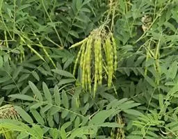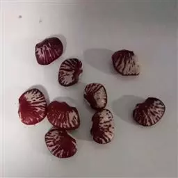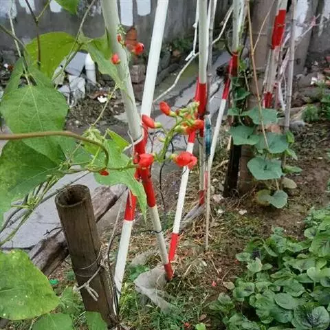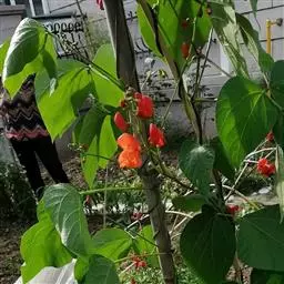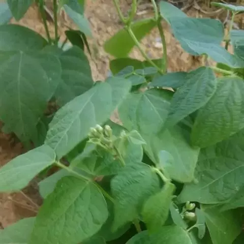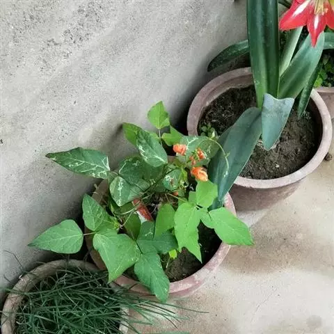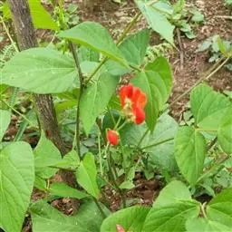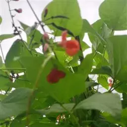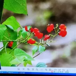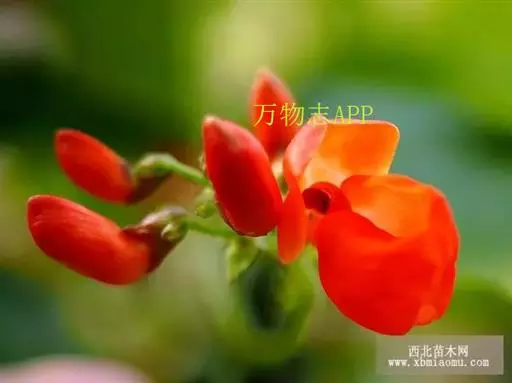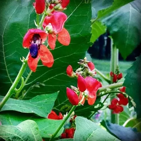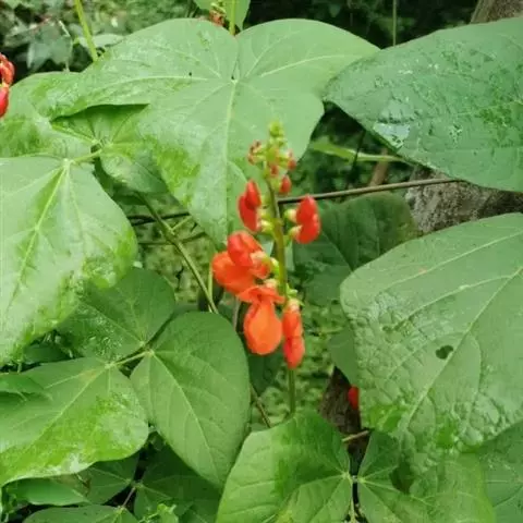 多花菜豆 多年生缠绕草本。在温带地区通常作一年生作物栽培,长可达5—7米。被毛或无毛。羽状复叶具3小叶;托叶小,不显著;小叶卵形或卵状菱形,长7.5-12.5厘米,宽有时过于长,先端渐尖或稍钝,两面被柔毛或无毛。花多朵生于较叶为长的总花梗上,排成总状花序;苞片长圆状披针形,通常和花梗等长,多少宿存,小苞片长圆状披针形,与花萼等长或较萼为长;花萼阔钟形,无毛或疏被长柔毛,萼齿远较萼管为短;花冠通常鲜红色,偶为白色,长1.5-2厘米。荚果镰状长圆形,长(5-)-16(-30)厘米,宽约1.5厘米;种子阔长圆形,长1.8-2.5厘米,宽1.2-1.4厘米,顶端钝,深紫色而具红斑、黑色或红色,稀为白色。