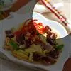14. 将炒好的洋葱肉末均匀的浇在茄子上;