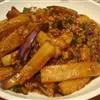 15. 同时将炒好的料汁均匀的倒在茄子上;