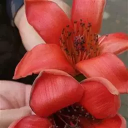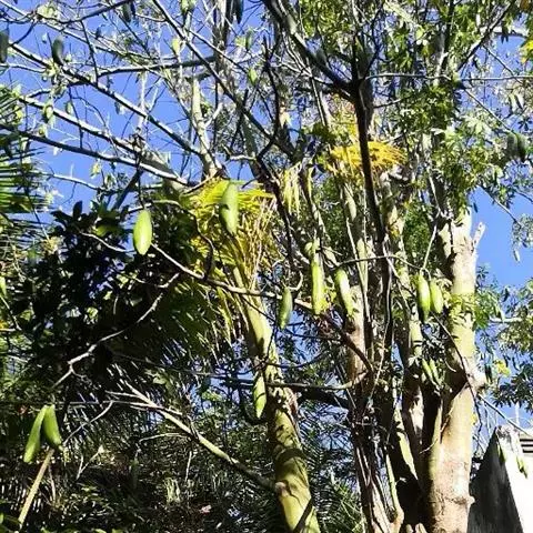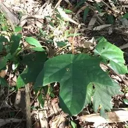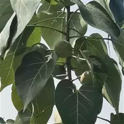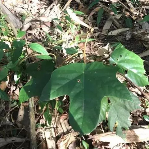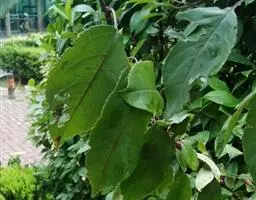 胖大海 落叶乔木,高可达40m,单叶互生,叶片革质,卵形或椭圆状披针形,长10~20cm,宽6~12cm,通常3裂,全缘,光滑无毛。圆锥花序顶生或腋生,花杂性同株;花萼钟状,深裂;雄花具10~15个雄蕊;雌花具1枚雌蕊。骨朵果1~5个,着生于果梗,呈船形,长可达24cm。种子棱形或倒卵形,深褐色和土黄色。