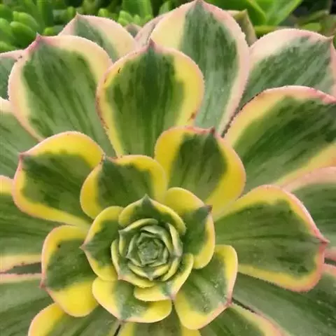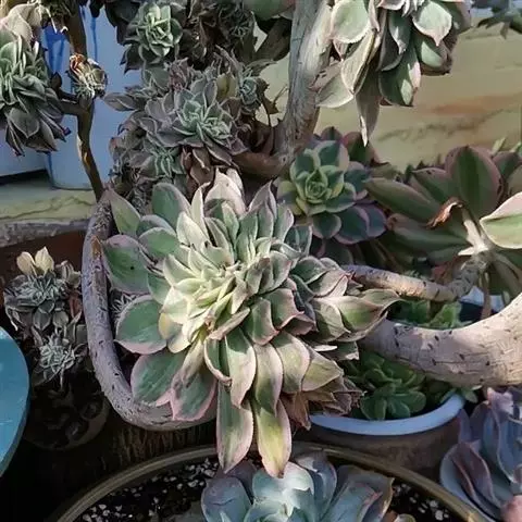 红缘莲花掌 多年生肉质草本植物,植株呈多分枝的亚灌木状,高25~50厘米,分枝顶端的叶子排列成莲座状。叶片倒卵形,具细尖,叶长2.5~5厘米,质稍厚,蓝绿至灰绿色,被白霜,叶面具光泽,叶缘红色至红褐色,并有细齿。聚伞花序,花浅黄色,有时带红晕。莲花掌为莲花掌属植物,植株多分枝,肉质叶在枝头排成莲座状,叶片较薄,形状有倒卵形、舌形、肾形,叶缘有短毛,总状花序,花后植株枯死。