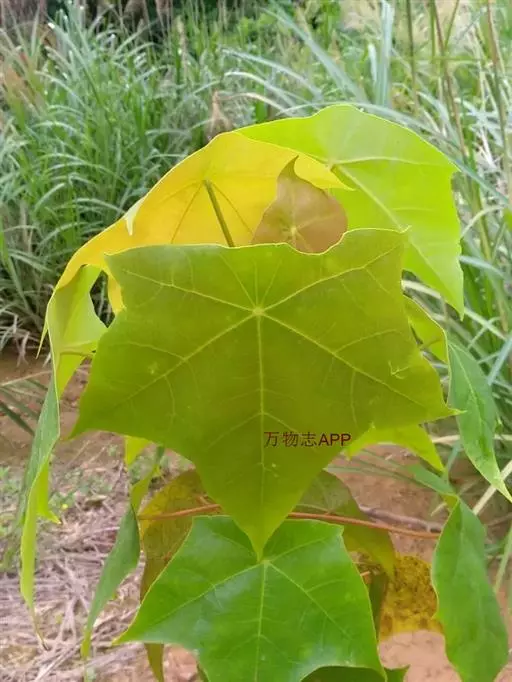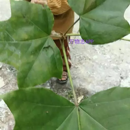常绿乔木,高达30米;小枝粗壮,无毛,节膨大,有环状托叶痕。叶革质,阔卵圆形,全缘,或幼叶先端3浅裂,长10-13厘米,宽7-10厘米,先端短尖,基部心形;上面干后橄榄绿色,有光泽;下面黄绿色,或稍带灰色,无毛;掌状脉5条,在上面明显,在下面突起,网脉不大明显;叶柄长7-10厘米,圆筒形,无毛。