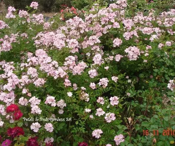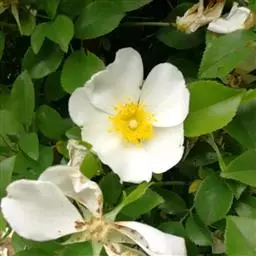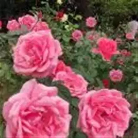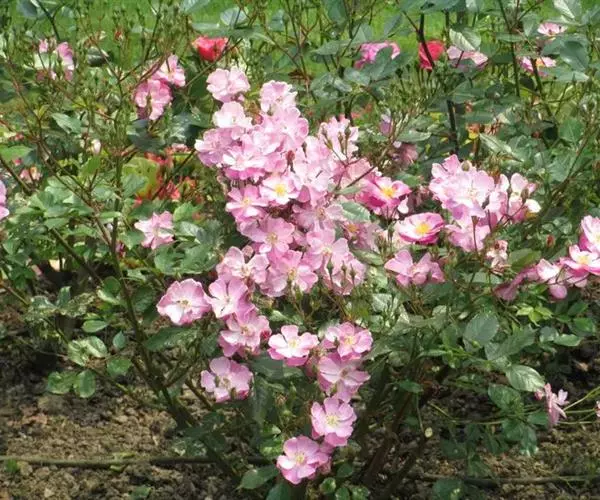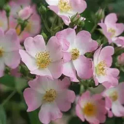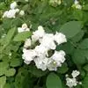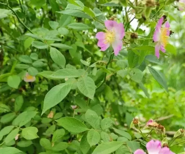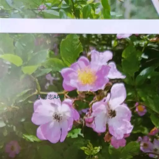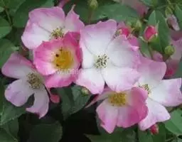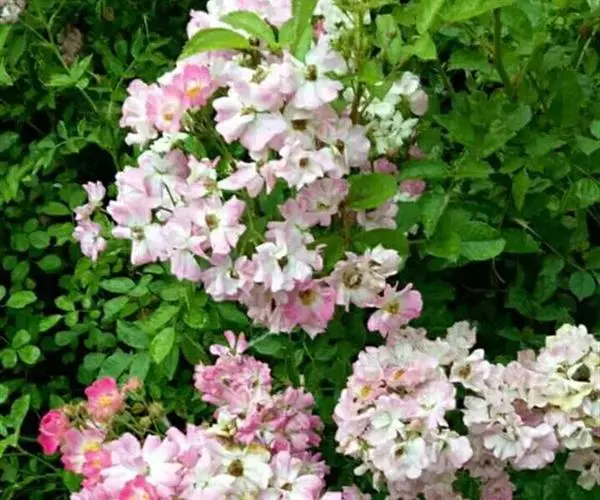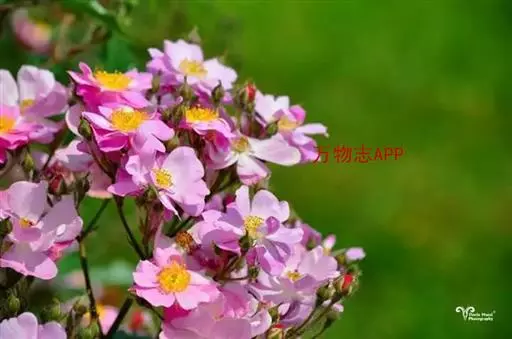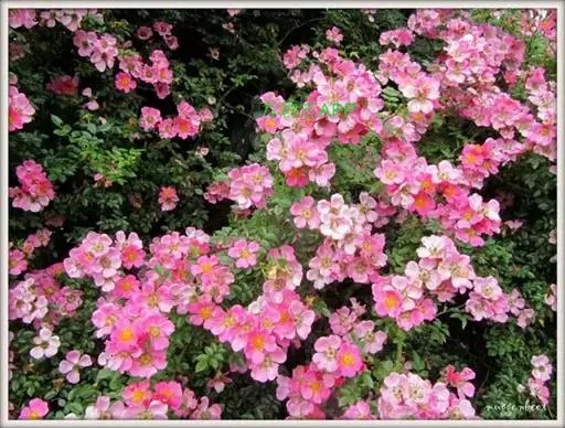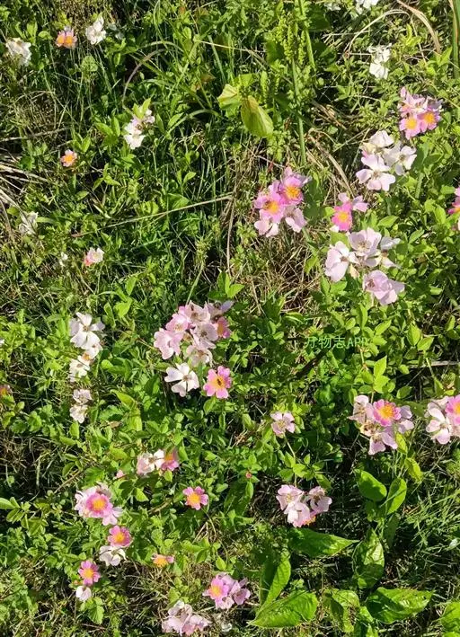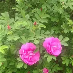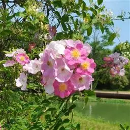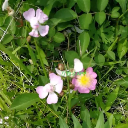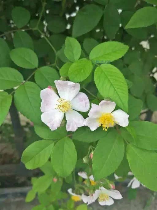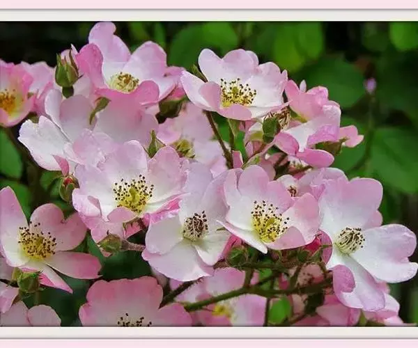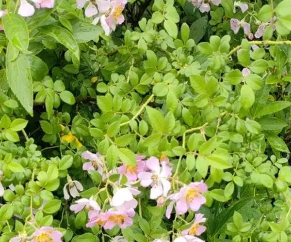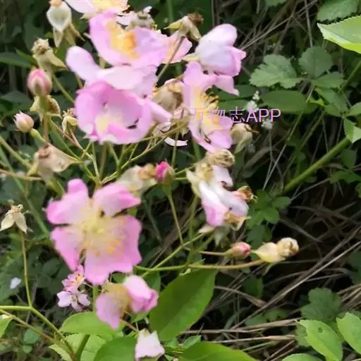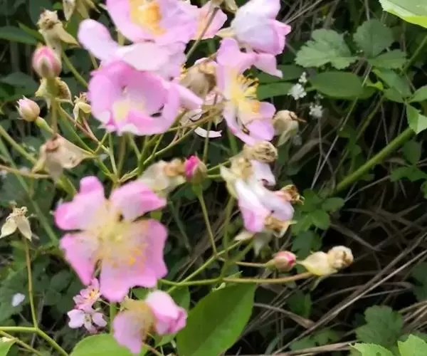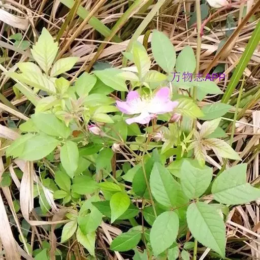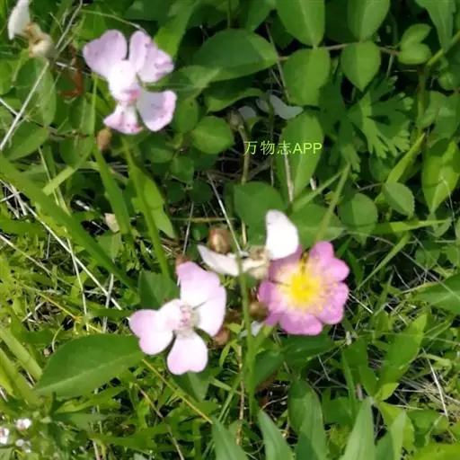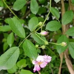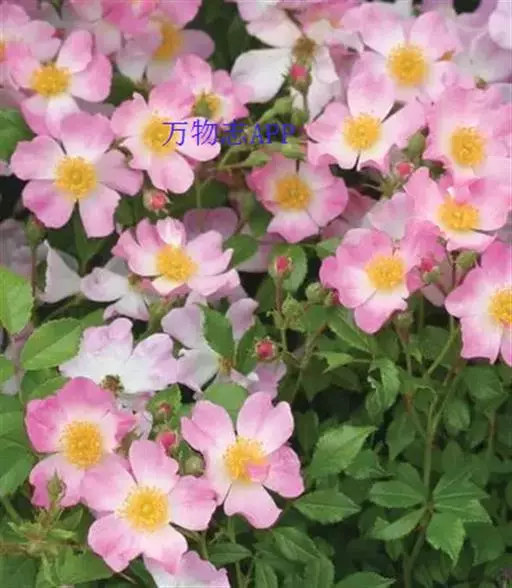 粉团蔷薇(学名:Rosa multiflora Thunb. var. cathayensis Rehd. ):攀援灌木;小枝圆柱形,通常无毛,小叶倒卵形、长圆形或卵形,边缘有尖锐单锯齿,上面无毛,下面有柔毛;花多朵,排成圆锥状花序,花直径1.5-2厘米,萼片披针形,花瓣宽倒卵形,先端微凹,基部楔形;花柱结合成束,无毛,比雄蕊稍长。果近球形,红褐色或紫褐色,有光泽,无毛,萼片脱落。系野蔷薇的一个变种,小叶较大,通常5-7。花粉红,花较大,单瓣,平顶伞房花序。果实较小,少种子或无种子。