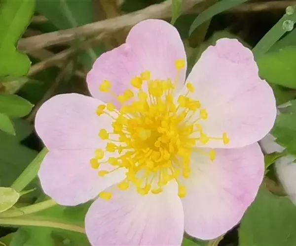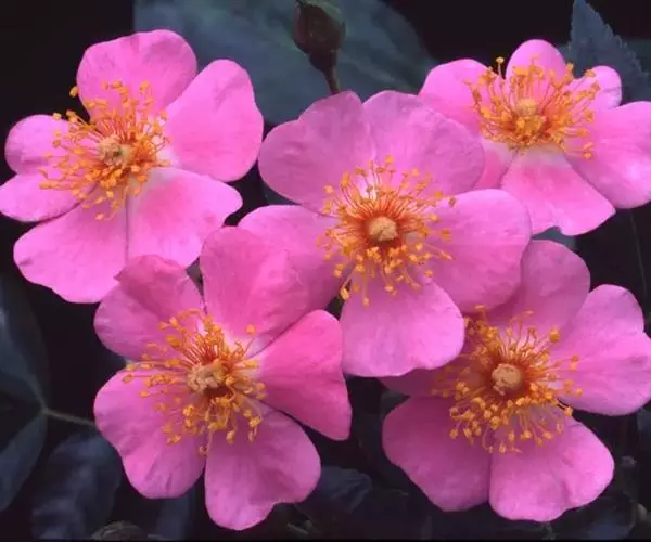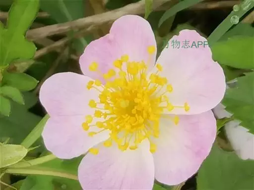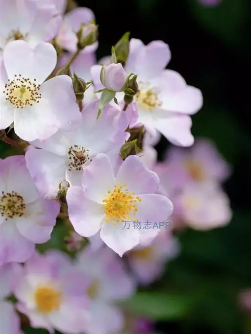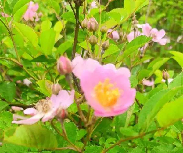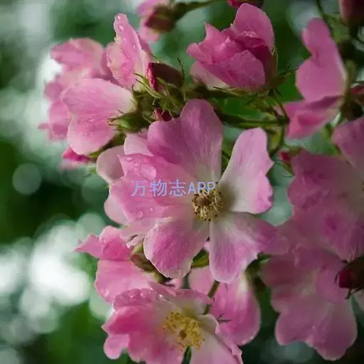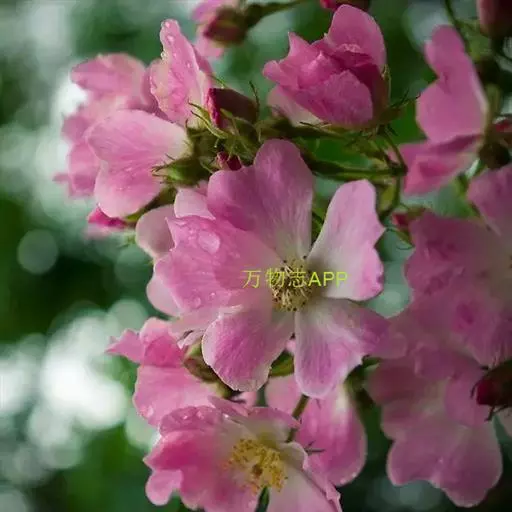 花多朵,排成圆锥状花序,花梗长1.5-2.5厘米,无毛或有腺毛,有时基部有篦齿状小苞片;花直径1.5-2厘米,萼片披针形,有时中部具2个线形裂片,外面无毛,内面有柔毛;花瓣粉红色,单瓣,宽倒卵形,先端微凹,基部楔形;花柱结合成束,无毛,比雄蕊稍长。果近球形,直径6-8毫米,红褐色或紫褐色,有光泽,无毛,萼片脱落。