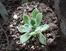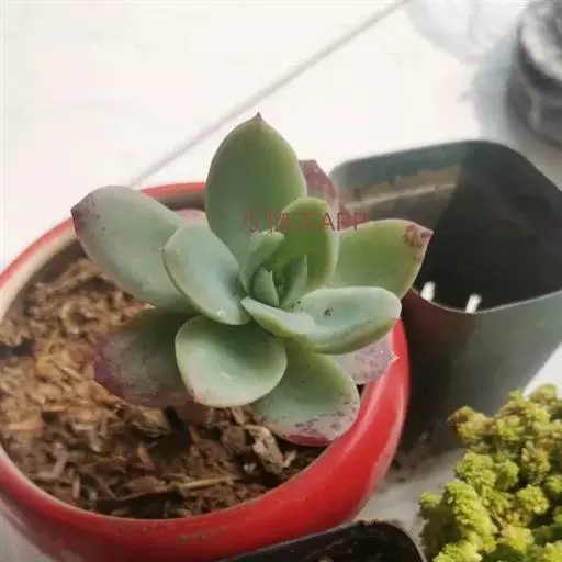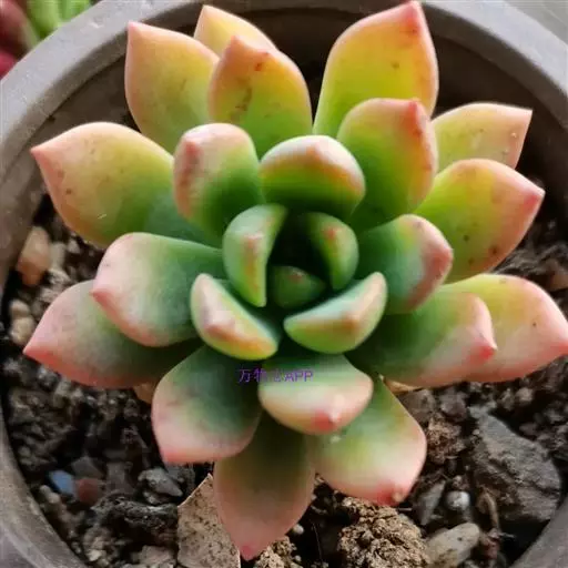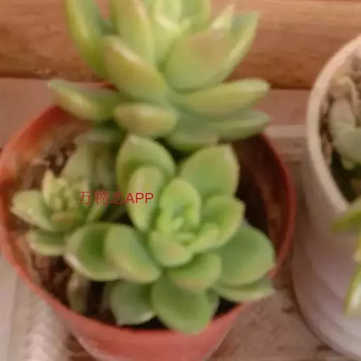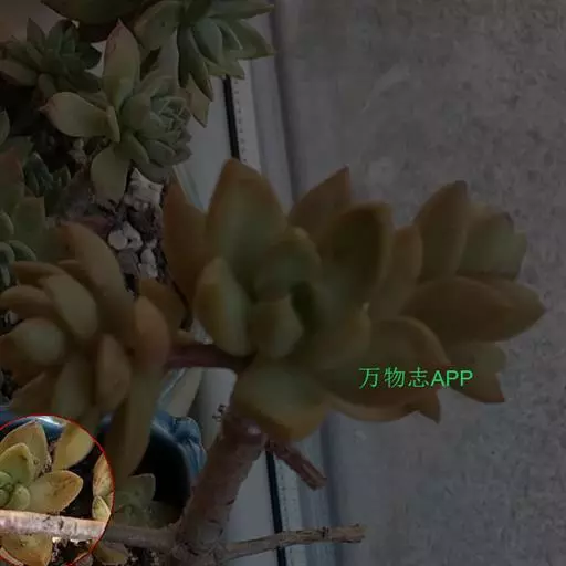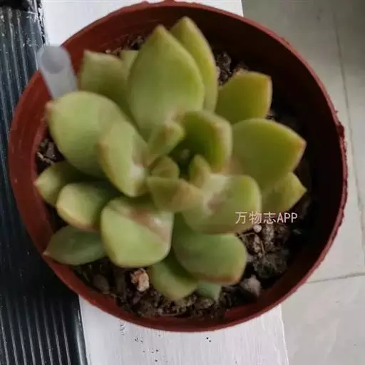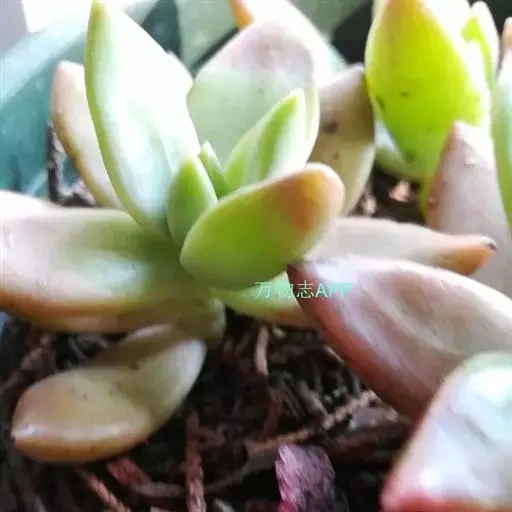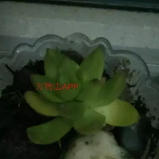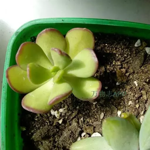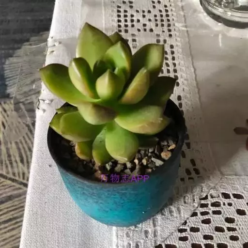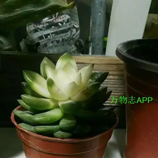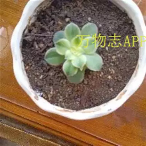 黄丽,多肉类植物,植株具短茎,肉质叶,排列紧密,呈莲座状,叶片匙形,顶端有小尖头,叶片松散。