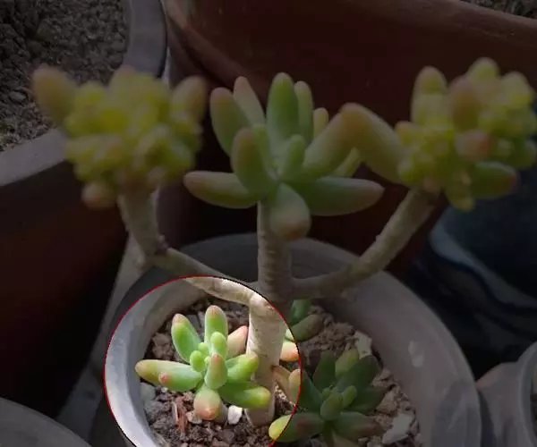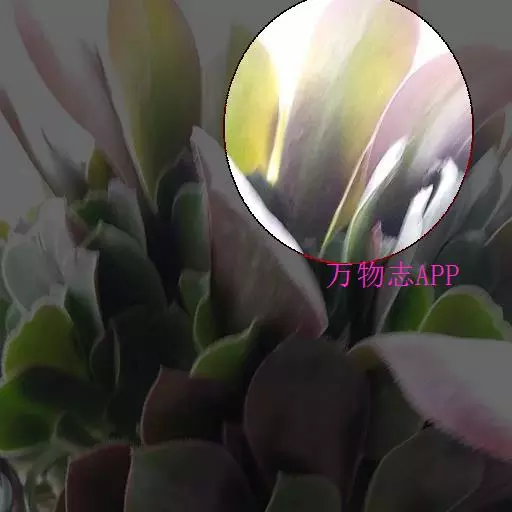 表面附蜡质呈黄绿色或金黄色偏红,长期生长于阴凉处时叶片呈绿色,光照充足情况下,叶片边缘会泛红,花单瓣,聚伞花序,浅黄色,较少开花。