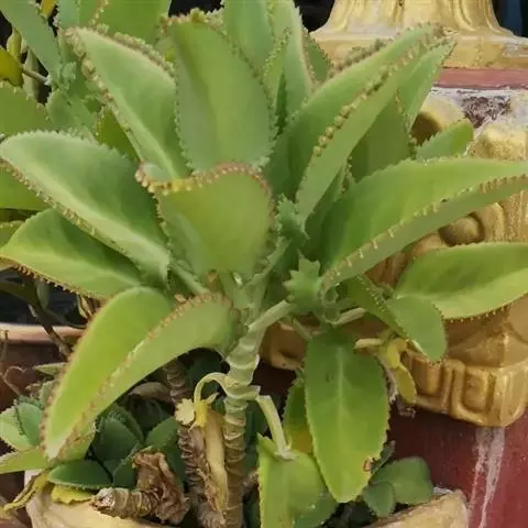 棒叶落地生根是景天科、落地生根属植物。茎直立、粉褐色。叶圆棒形,上表面有沟、粉色,有红褐斑。…