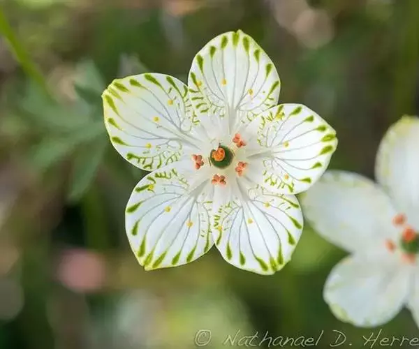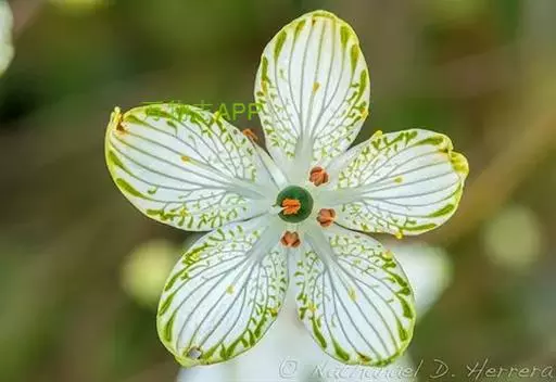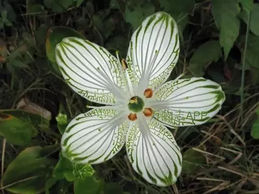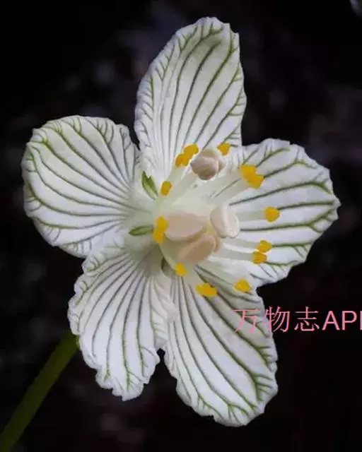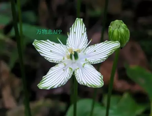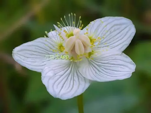 多年生草本,高达30-50cm。全株无毛。根茎短,近球形。基生叶丛生;叶柄长2.5-6cm;叶片卵圆形至心形,长1-3cm,宽1.5-3.5cm,先端钝圆或锐尖,基部心形,全缘,花茎中部生1无柄叶片,基部抱茎,与基生叶同形。花单生顶端,白色至浅黄色,直径2-3.5cm,形似梅花;萼片5,椭圆形,长约5mm;花瓣5,平展,卵状圆形,长约1cm,先端圆;雄蕊5,与花瓣互生;假雄蕊5,上半部11-22丝裂,裂片先端有头状腺体;心皮4,合生,子房上位,卵形;花柱极短,顶端4裂。蒴果,上部4裂。种子多数。花期7-8月,果期8-9月。