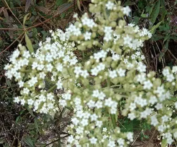 由聚伞花序组成顶生圆锥花序或伞房花序,分枝达5-6级,花序梗密被长粗糙毛或仅二纵列粗糙毛;总苞叶卵状披针形至线状披针形或线形;花萼小,萼齿5,浅波状或浅钝裂状,长0.3-0.5毫米,被短糙毛,有时疏生腺毛;花冠钟形,白色,5深裂,裂片不等形,卵形、卵状长圆形或卵状椭圆形,长(0.75-)1.25-2毫米,宽1.1-1.65(-1.75)毫米,蜜囊顶端的裂片常较大,冠筒常比裂片稍长,长1.5-2.25(-2.6)毫米,宽1.7-2.3毫米,内面有长柔毛,筒基部一侧稍囊肿;雄蕊4,伸出;子房下位,花柱较雄蕊稍短。瘦果倒卵形,与宿存增大苞片贴生;果苞倒卵形、卵形、倒卵状长圆形或椭圆形,有时圆形,长(2.8-)4-5.5(-6.5)毫米,宽(2.5-)4-5.5(-8)毫米,顶端钝圆,不分裂或微3裂,基部楔形或钝,网脉明显,具主脉2条,极少有3条的,下面中部2主脉内有微糙毛。花期8-10月,果期9-11月。