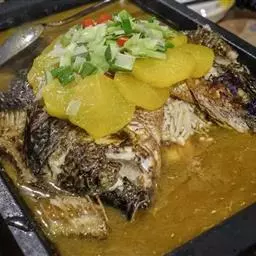 平锅鲤鱼是一道菜品,主料是鲤鱼、洋葱、葱姜蒜许、郫县豆瓣、小香葱、小米椒、老抽、糖、料酒、醋。