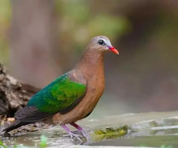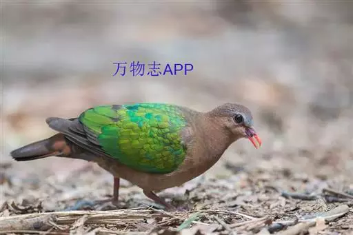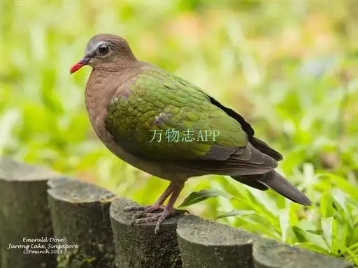 中等体型(25厘米)、尾甚短的地栖型斑鸠。下体粉红,头顶灰色,额白,腰灰,两翼具亮绿色。雌鸟头顶无灰色。飞行时背部两道黑色和白色的横纹清晰可见。 虹膜-褐色;嘴-红色,嘴尖橘黄;脚-红色。