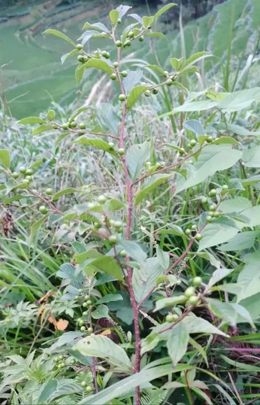 花数个或10余个密集成腋生聚伞花序,总花梗长4-10,稀15毫米,被柔毛,花梗长2-4毫米,被短柔毛;萼片三角形与萼管等长,外面有疏微毛;花瓣近圆形,顶端2裂;雄蕊与花瓣等长而短于萼片;子房球形,无毛,3室,每室具1胚珠,花柱不分裂,柱头不明显。核果球形或倒卵状球形,绿色或红色,成熟时黑色或紫黑色,长5-6毫米,直径6-7毫米,果梗长3-6毫米,无或有疏短毛,具3分核,各有种子1个;种子无沟。花期5-8月,果期8-10月。