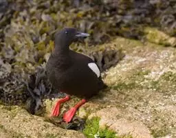 白腹海鹦,前趾间有蹼膜,后趾缺如。翅窄而短小,尾短。体羽黑白二色,雌雄羽色相似