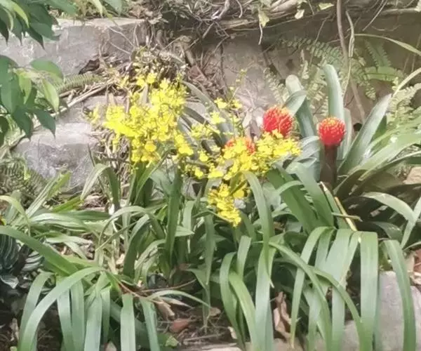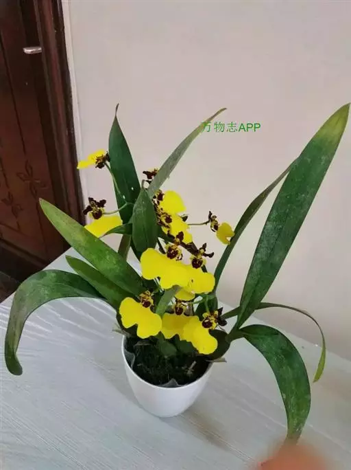 华彩文心兰(O.Splendidum),花黄色、具棕色条纹,唇瓣大、金黄色。