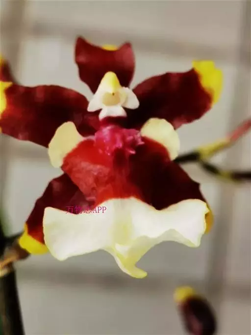 大花文心兰(O.Macranthum),花大,花径10厘米,花瓣黄色,萼片棕色、波状。