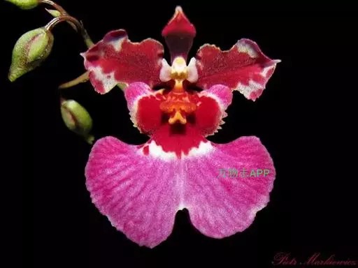皱状文心兰(O.Crispum),花大,皱瓣,花径8厘米,花瓣褐色具金黄色中心。