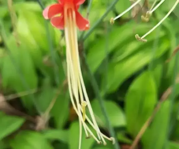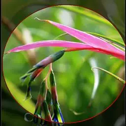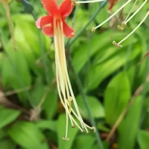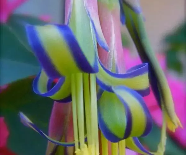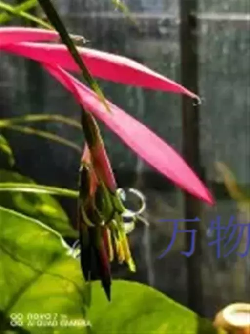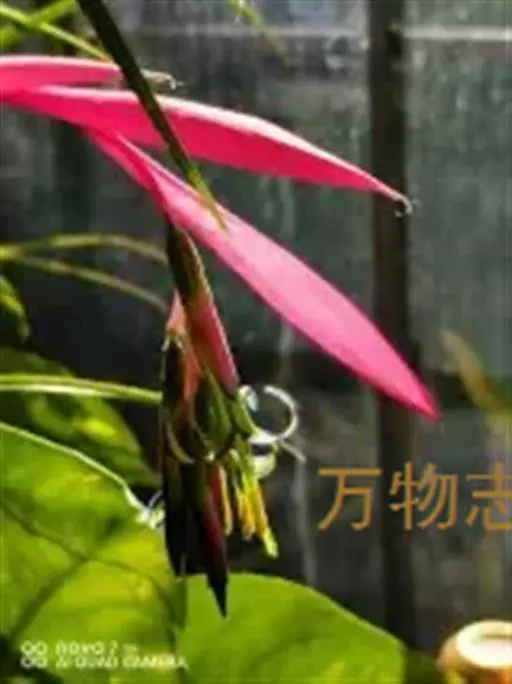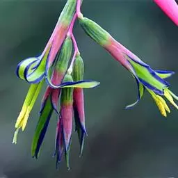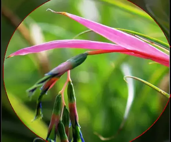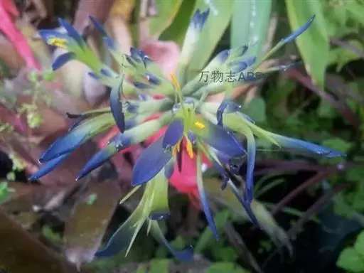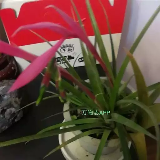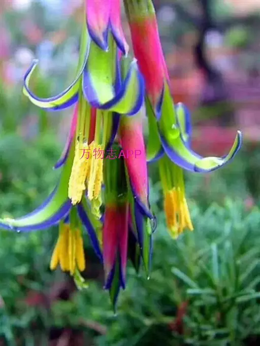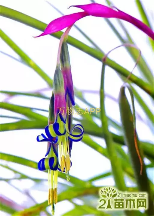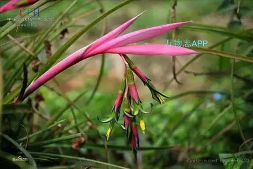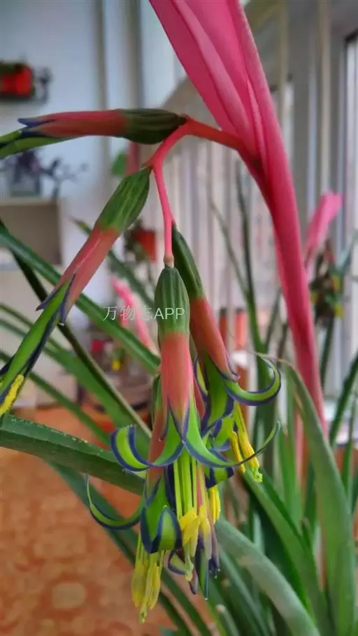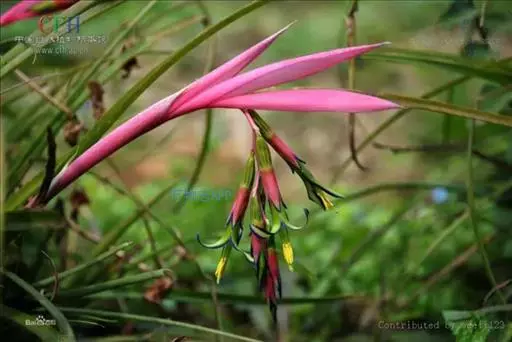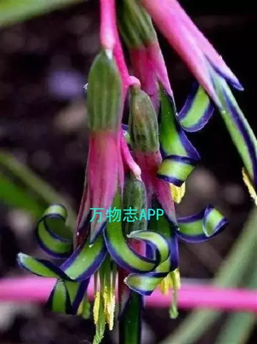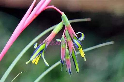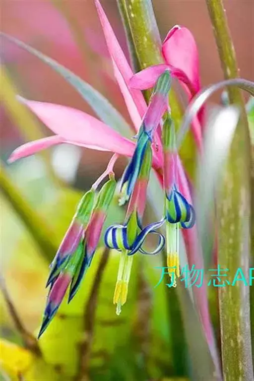 垂花水塔花(Billbergia nutans Wendl.)凤梨科观赏植物,茎极短。叶莲座状丛生,长达50厘米,先端下垂,叶缘有疏小刺;花葶长30厘米,先端下垂,具花4-12朵,无毛,花序轴膝状折曲;总苞片狭、紧贴花葶,粉红色到淡红色;花萼3枚,橙红色,边缘蓝紫色,花瓣3枚,绿色,边缘蓝紫色,先端急尖,反折;雄蕊6枚;花药伸出花外;子房下位,绿色,中轴胎座,柱头扭转。种子多数,小。