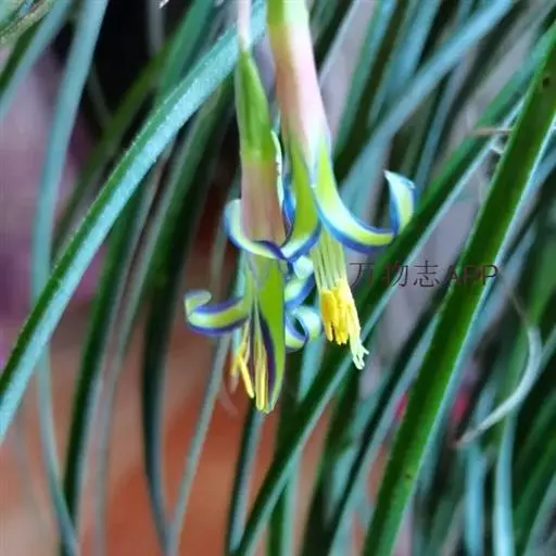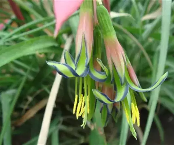 茎极短。叶莲座状丛生,长达50厘米,宽15毫米,先端下垂,叶缘有疏小刺;花葶长30厘米,先端下垂,具花4-12朵,无毛,花序轴膝状折曲;总苞片狭、紧贴花葶,粉红色到淡红色;花萼3枚,长1.3-2.7厘米,橙红色,边缘蓝紫色,花瓣3枚,长3.6-4厘米,绿色,边缘蓝紫色,先端急尖,反折;雄蕊6枚;花药长7毫米,伸出花外;子房下位,绿色,长1厘米,中轴胎座,柱头扭转。种子多数,小。