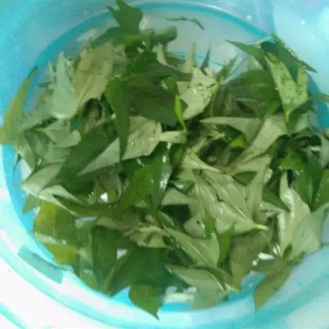 1.原料。取红薯嫩叶,去杂质、泥沙和霉变叶,放入洗涤槽中用流动清水充分洗净,捞出沥净水分。