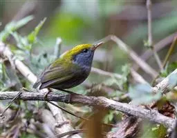 金冠地莺:形态与灰腹地莺相似,上体橄榄绿,前额至头顶渲染亮金黄色;下体几乎纯暗石板灰色,…