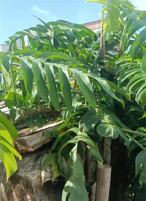 藤本植物,攀援极高。茎圆柱形,粗壮,下部粗2.5-4厘米,多分枝;气生根具发达的皮孔,平伸,紧贴于树皮或石面上。叶柄长25-40厘米,上部有长2.2厘米的膨大关节;叶鞘膜质,上达关节部位,逐渐撕裂,脱落;叶片薄革质,幼叶狭披针形或披针状长圆形,基部浅心形,成熟叶宽的长圆形,基部宽心形,沿中肋有2行星散的、有时为长达2毫米的小穿孔,叶片长40-60厘米,宽30-40厘米,两侧不等地羽状深裂,裂片线形,基部和顶端等宽或略狭,裂弯宽5-7.5厘米,狭长渐尖,裂片上有叶片的I级侧脉1-3条,II级侧脉与I级侧脉成极小的锐角,后逐渐与之平行。花序柄圆柱形,粗壮,长10-14厘米,基部有鞘状鳞叶包围。佛焰苞外面绿色,内面黄色,长10-12厘米,渐尖。肉穗花序圆柱形,钝,长约10厘米,粗3厘米。雌蕊具棱,长5-6毫米,顶平,柱头无柄,线形,纵向;胚珠2-4,着生于胎座的近基部。种子肾形,稍光滑。花期4-5月。