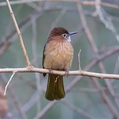 栗背短脚鹎,体长18-22厘米。上体栗褐,头顶和羽冠黑色。背栗色、翅和尾暗褐色具白色或灰白色羽缘。…