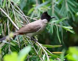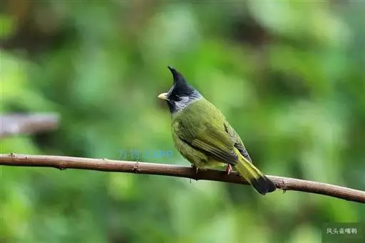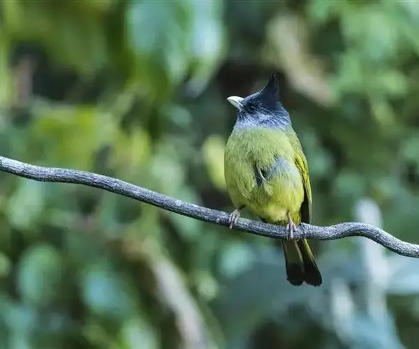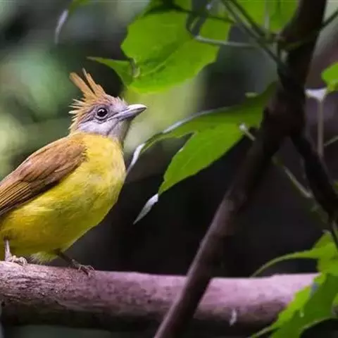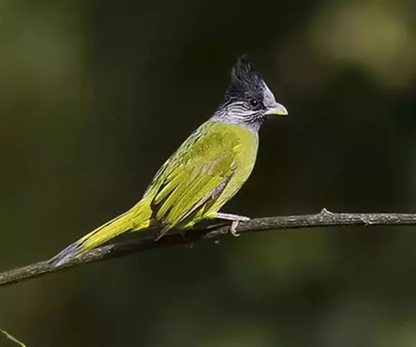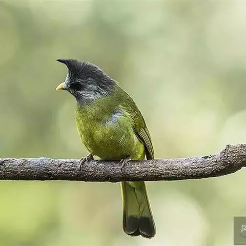 凤头雀嘴鹎(学名:Spizixos canifrons):属小型鸟类,体长18-22厘米。嘴粗短、呈象牙色或乳黄色,前额和脸灰色,头顶黑色,有一朝前竖立的黑色羽冠。上体橄榄绿色,下体黄绿色,尾羽黄绿色具宽阔的黑褐色端斑。