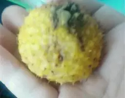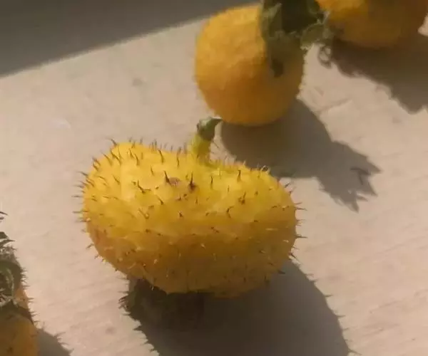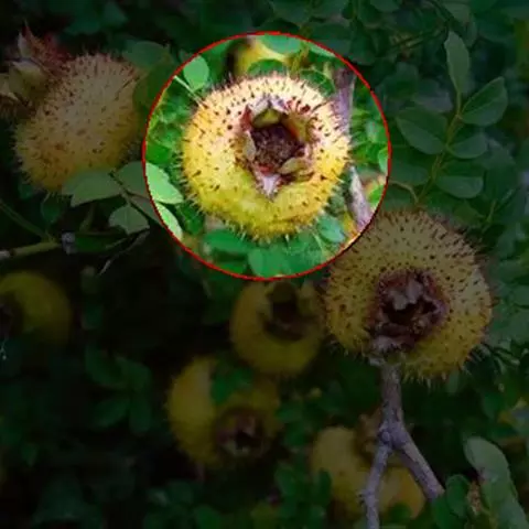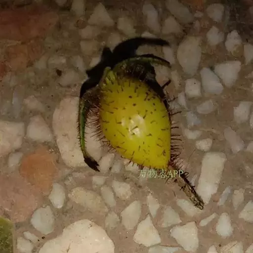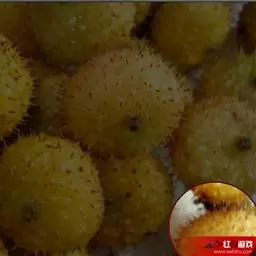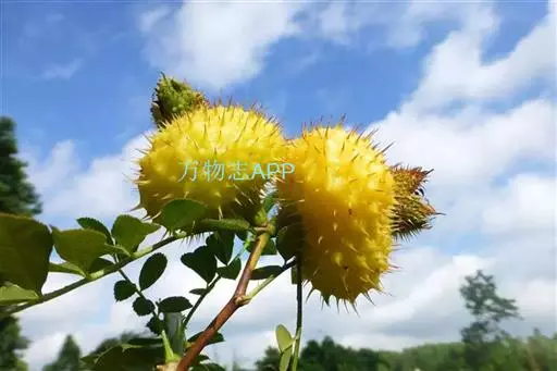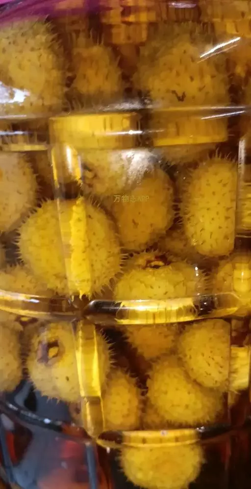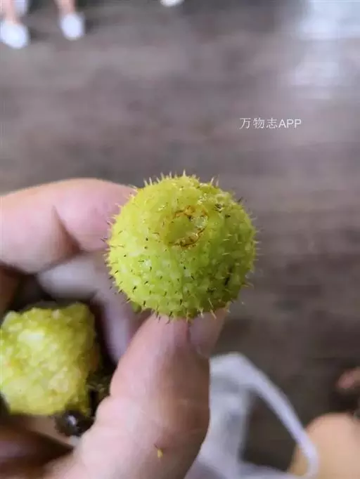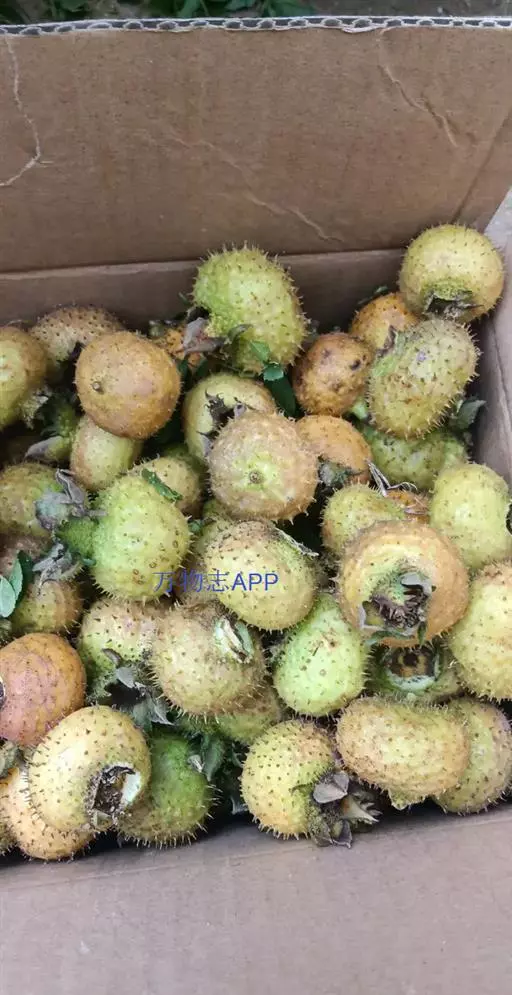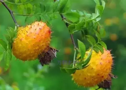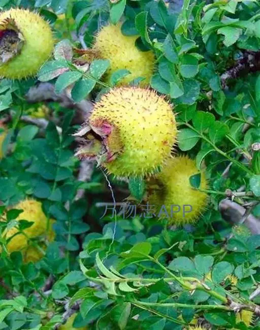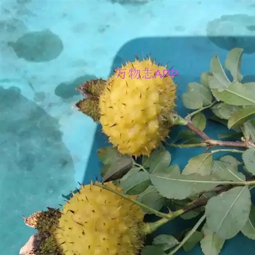 果扁球形,直径3-4厘米,绿红色,外面密生针刺;萼片宿存,直立。花期5-7月,果期8-10月。