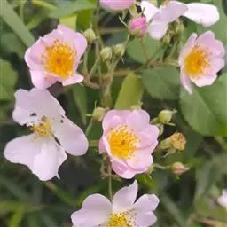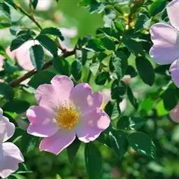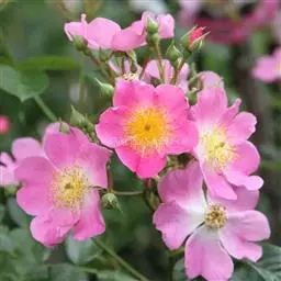 缫丝花花朵秀美,粉红的花瓣中密生一圈金黄色花药,十分别致,黄色刺颇具野趣,适用于坡地和路边丛植绿化,也用作药蓠材料。