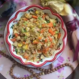 烤肉饭主料由土豆,烤肉、青豆等食材,辅料由葱,姜,蒜,洋葱,生抽,老抽,蜂蜜,耗油,…