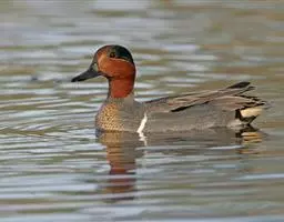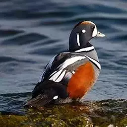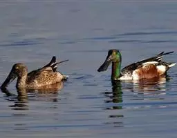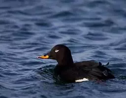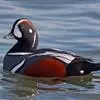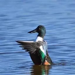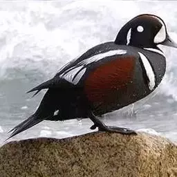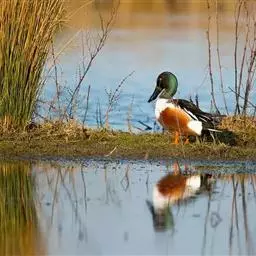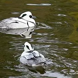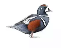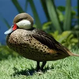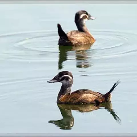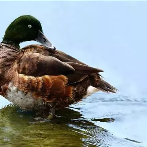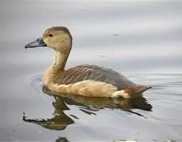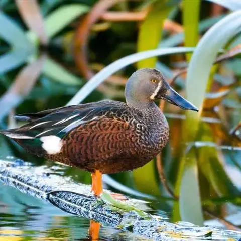 麝鸭(学名:Biziura lobata):雄性麝鸭是澳大利亚最大的水鸭,具有强壮的体形,羽色黯淡。嘴部有瘤疣附生物,羽毛散出一种近似麝香的香气(尾脂腺分泌物)。属于硬尾鸭亚科,具有长而坚硬的尾羽,游泳时尾羽可没入水中,而有时尾羽可以竖起,如同扇子的形状。主要吃植物性食物,也吃水生昆虫、甲壳类、青蛙等水生动物。