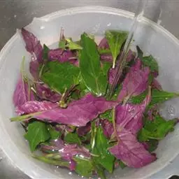 烹制:紫背菜洗净;咸蛋去壳。在镬中加入清水1250毫升(5碗量)和咸蛋黄,武火滚沸约5分钟,下紫背菜滚沸至熟,改为文火均匀地放入拌匀的咸蛋白,因咸蛋已具咸味、试味后才下或不下食盐,调入少许生油便可。亦汤亦菜,此量可供3~4人用。