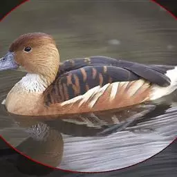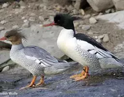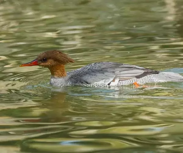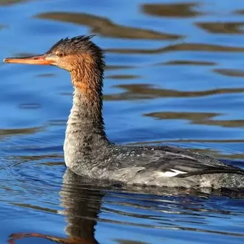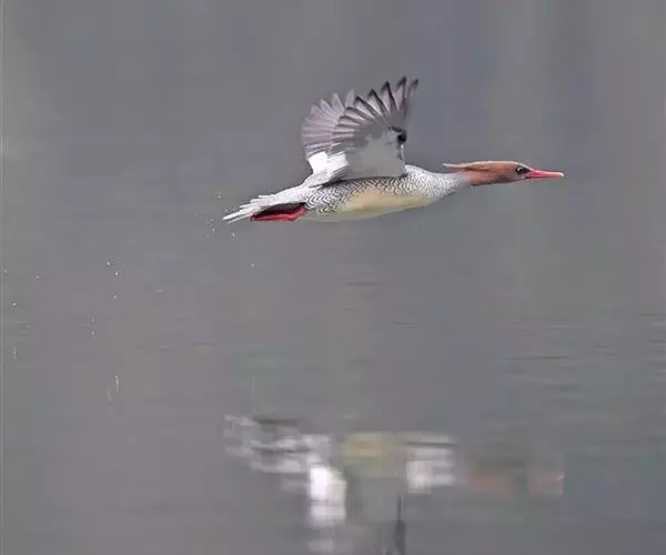 雌鸟的头和颈棕褐色;上背褐色;下背、腰和尾上覆羽由褐色逐渐变为灰色,并具白色横斑;尾黑褐色,沾灰色;下体白色,肩和下体两侧具鳞状斑。色暗而多灰色,与红胸秋沙鸭的区别在于体侧具同轴而灰色宽黑色窄的带状图案。