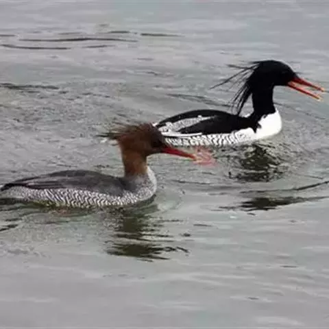 中华秋沙鸭(学名:Mergus squamatus)为鸭科秋沙鸭属的鸟类,俗名鳞胁秋沙鸭,是中国的特有物种。嘴形侧扁,前端尖出,与鸭科其它种类具有平扁的喙形不同。嘴和腿脚红色。雄鸭头部和上背黑色下背、腰部和尾上覆羽白色;翅上有白色翼镜;头顶的长羽后伸成双冠状。胁羽上有黑色鱼鳞状斑纹。