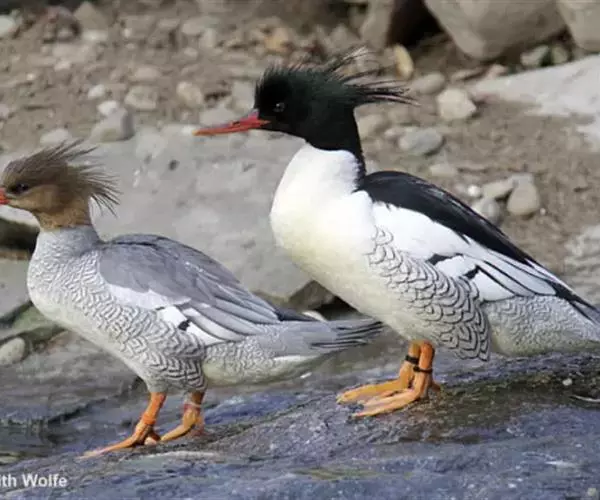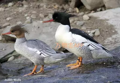 两胁的羽毛上具有黑色鳞纹是这种秋沙鸭最醒目的特征,所以早先的名字叫鳞胁秋沙鸭。后来,鸟类学家发现它们的原产地是中国吉林省长白山地区,分布范围狭小,只有零星个体偶尔飞到朝鲜和俄罗斯远东地区境内,所以才改称它为中华秋沙鸭。此外,像凤头一样,脑后有两簇冠羽也是它的特有标志。