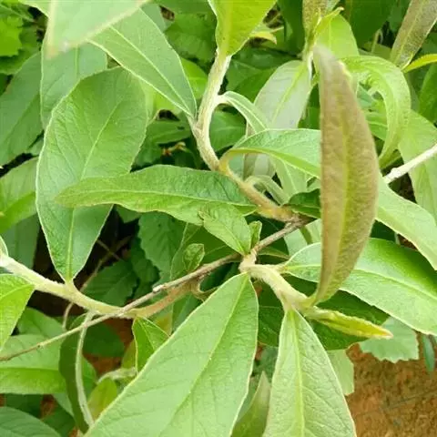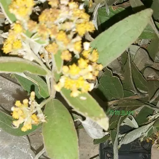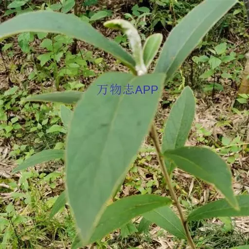 叶多少开展,长圆形或长圆状披针形;中部叶长10-16厘米,有长约0.5厘米的柄,上部叶渐小近无柄;全部叶基部圆形或近楔形,顶端钝或急尖,边缘有小尖头状细齿或浅齿,上面被基部疣状的密糙毛,沿中脉被较密的毛,下面被白色或污白色绢状厚茸毛;中脉和10-12对侧脉在下面高起,网脉明显。