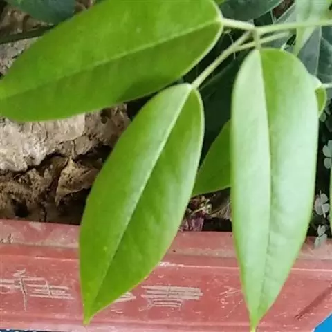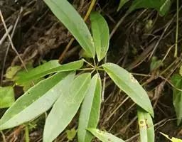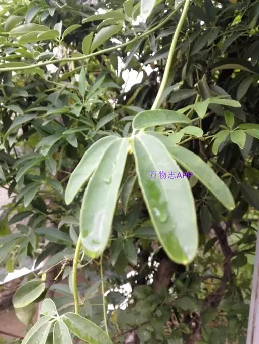 常绿木质藤本。茎与枝圆柱形,灰褐色,具线纹。掌状复叶有小叶(3)5-7(9)片;叶柄长2-5厘米;小叶近革质或革质,线状长圆形、长圆状披针形至倒披针形,长5-9(11)厘米,宽1.2-2(3)厘米,先端渐尖、急尖、钝或圆,有时凹入,基部钝、阔楔形或近圆形,边缘略背卷,上面绿色,有光泽,下面苍白色密布极微小的乳凸;中脉在上面凹陷,在下面凸起,侧脉每边6-10条,与基出2脉均至近叶缘处弯拱网结;网脉和侧脉在两面均明显凸起或在上面不显著在下面微凸起;小叶柄长5-25毫米。