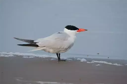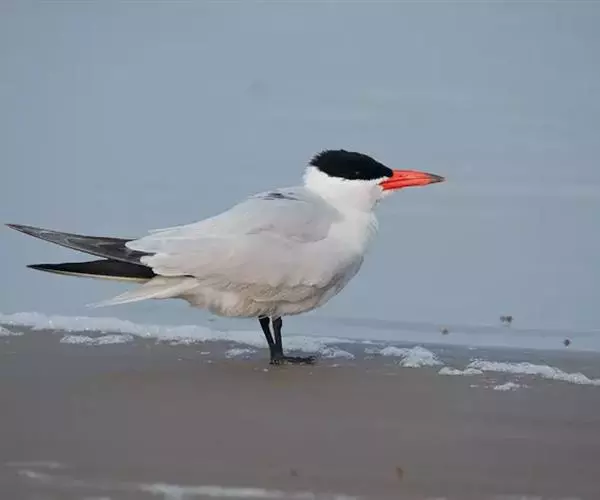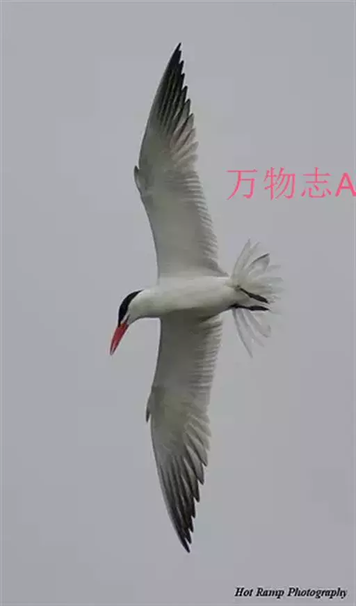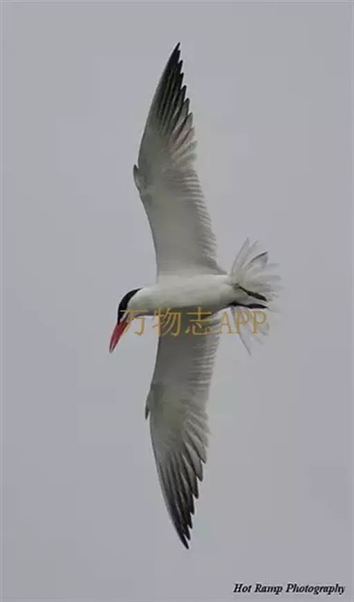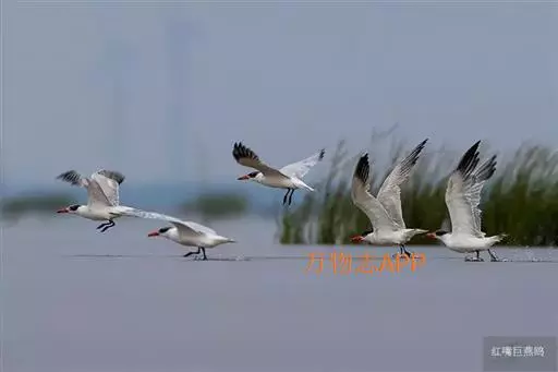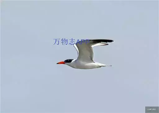 红嘴巨鸥(学名:Sterna caspia),大型水鸟,体长47~55厘米。夏羽前额、头顶、枕和冠羽黑色。后颈、尾上覆羽和尾白色,尾呈叉状。背、肩和翅上覆羽银灰色。眼先和眼及耳羽以下头侧白色;颏、喉和整个下体也为白色。冬羽和夏羽大致相似,但额和头顶白色,具黑色纵纹。有些头全为白色,仅耳区有黑色斑。上体较淡。主要栖息于海岸沙滩、平坦泥地、岛屿和沿海沼泽地带。常成小群在一起营巢,很少单独成对营巢的。卵的颜色为赭色、绿白色、赭白色或淡褐色,被有淡褐色或黑色斑点。