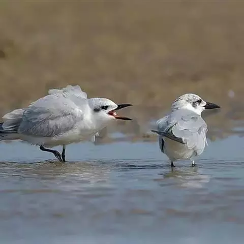 鸥嘴噪鸥,中型水禽,体长31~39厘米。夏羽额、头顶、枕和头的两侧从眼和耳羽以上黑色。背、肩、腰和…
