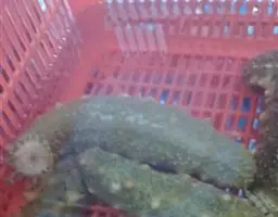 浮游幼体培育6-9d后,即当幼体已部分变态为樽形幼体,比例 海参 占整个幼体的10%-20%时开始采苗,采苗器采用33cm×40cm塑料波纹板,投放量为100片/m2,分5栏,每栏竖置20片。使用前,用0.05%-0.1%的NaOH浸泡1d,接着用10-20mg/L的KMnO4溶液洗刷,然后再用过滤海水冲洗干净。将洗刷干净的采苗器放入饵料池中接种底栖藻,过10-20d后,采苗器将附着一层薄嫩底栖硅藻,以此诱集稚参的采集。通常,附着器应按100片/m2投入,附着密度1-3头/cm2稚参较为合适。投放附着器以后应适当充气养殖。