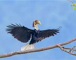 花冠皱盔犀鸟雄鸟体长约105厘米,雌鸟较小。尾白,雄雌两性的背、两翼及腹部均为黑色,但雄鸟头部奶白色,…