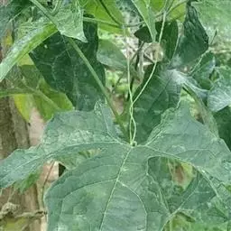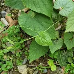 一年生草质攀援藤本;茎稍粗壮,具明显的棱角,被短柔毛。卷须粗壮,下部具棱,常3歧,有短柔毛。叶柄粗壮,棱上具柔毛,长8-12厘米;叶片近圆形,膜质,长、宽均为15-20厘米,常为5-7浅裂,中间裂片宽三角形,稍长,其余的裂片不等大,基部裂片最小,顶端急尖或渐尖,边缘疏生锯齿,基部弯缺近圆形,深2-2.5厘米,宽1-2厘米,上面深绿色,粗糙,下面苍绿色,两面脉上有短柔毛。