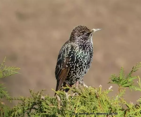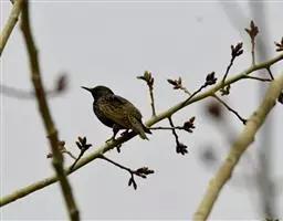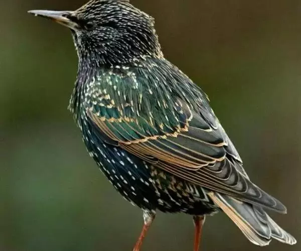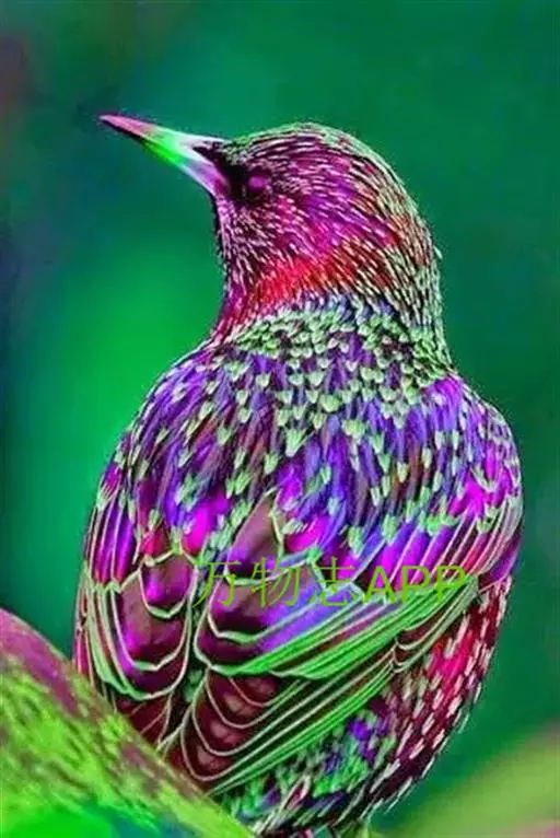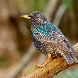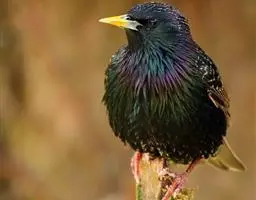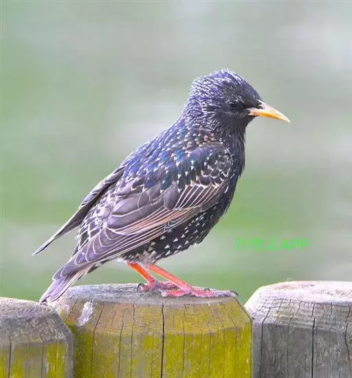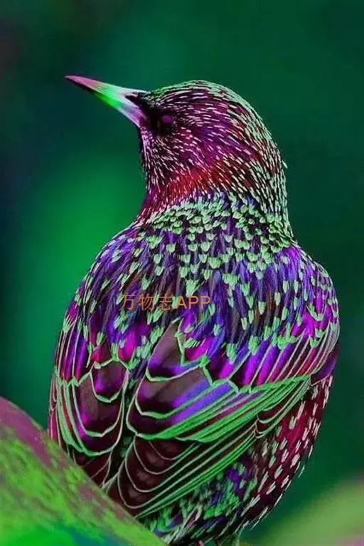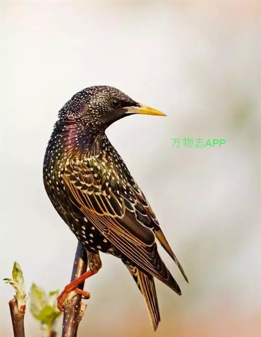 紫翅椋鸟(学名:Sturnus vulgaris):全长约20-24厘米,是中等体型的椋鸟。体羽新时为矛状,羽缘锈色而成扇贝形纹和斑纹,旧羽斑纹多消失。闪辉黑、紫、绿色。具不同程度白色点斑。虹膜深褐色;嘴黄色;脚略红。