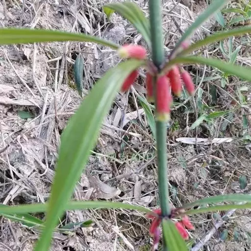 滇黄精(Polygonatum kingianum Coll. et Hemsl)百合科黄精属草本植物,根状茎近圆柱形或近连珠状,结节有时作不规则菱状,肥厚。茎顶端作攀援状。叶轮生,每轮3-10枚,条形、条状披针形或披针形,先端拳卷。花序具花,总花梗下垂,花梗苞片膜质,微小,通常位于花梗下部;花被粉红色,裂片长3-5毫米;花丝长3-5毫米,丝状或两侧扁,花药长4-6毫米;子房长4-6毫米。浆果红色,直径1-1.5厘米,具7-12颗种子。花期3-5月,果期9-10月。