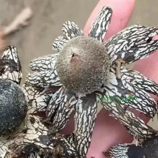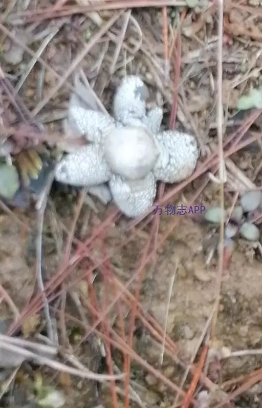 2、尖顶地星:又名土星菌、米屎疏。包被呈圆球形,顶部具一尖喙。包被径3-8cm,外包被呈芒状开裂5-8瓣,背面灰色,腹面肉桂色,有龟裂。内包被灰色,薄膜状,直径1.7-2.7cm。成熟时顶端开裂。孢体锈褐色,基部有短柄状的轴托。孢子球形,褐色,有疣突,3.5-5.5μm。孢丝线状,淡褐色,径5-6μm。