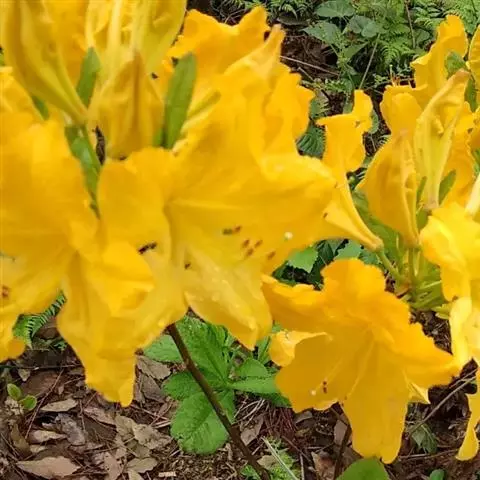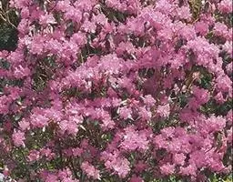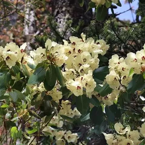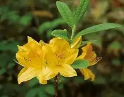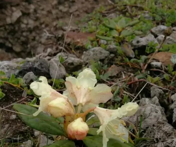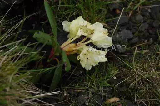 牛皮杜鹃(学名:Rhododendron aureum Georgi):常绿矮小灌木,高10-50厘米。茎横生,侧枝斜升,具宿存的芽鳞。叶革质,常4-5枚集生于小枝顶端,倒披针形或倒卵状长圆形,上面暗绿色,下面淡绿色。顶生伞房花序,有花5-8朵;花冠钟形,长2.5-3厘米,淡黄色,5裂,裂片近于圆形,稍不等大,上方一片具红色斑点。蒴果长圆柱形。花期5-6月,果期7-9月。