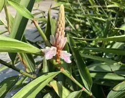 海南山姜是姜科,山姜属多年生草本植物,叶片带形,顶端渐尖并有一旋卷的尾状尖头,基部渐狭,…