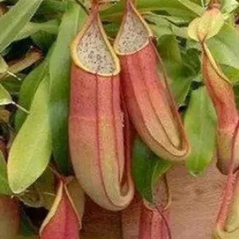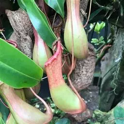 猪笼草属植物在自然界常常平卧生长。叶的构造复杂,分叶柄,叶身和卷须。卷须尾部扩大并反卷形成瓶状,可捕食昆虫。猪笼草具有总状花序,开绿色或紫色小花。猪笼草叶顶的瓶状体是捕食昆虫的工具。瓶状体的瓶盖复面能分秘香味,引诱昆虫。瓶口光滑,昆虫会被滑落瓶内,被瓶底分泌的液体淹死,并分解虫体营养物质,逐渐消化吸收。猪笼草,为猪笼草属植物的统称。是一种能够捕食昆虫的多年生草本植物,主产地是热带亚洲地区。猪笼草为地生植物,是攀援状的亚灌木。猪笼草拥有一幅独特的吸取营养的器官——捕虫囊,捕虫囊呈圆筒形,下半部稍膨大,因为形状像猪笼,故称猪笼草。在中国的产地海南又被称作雷公壶,意指它像酒壶。猪笼草依靠捕捉昆虫等小动物来补充营养的植物被称为食虫植物。