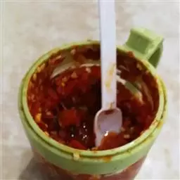 1、将调味料1用果汁机打成泥状(可加入少许色拉油)。油豆腐切片备用。